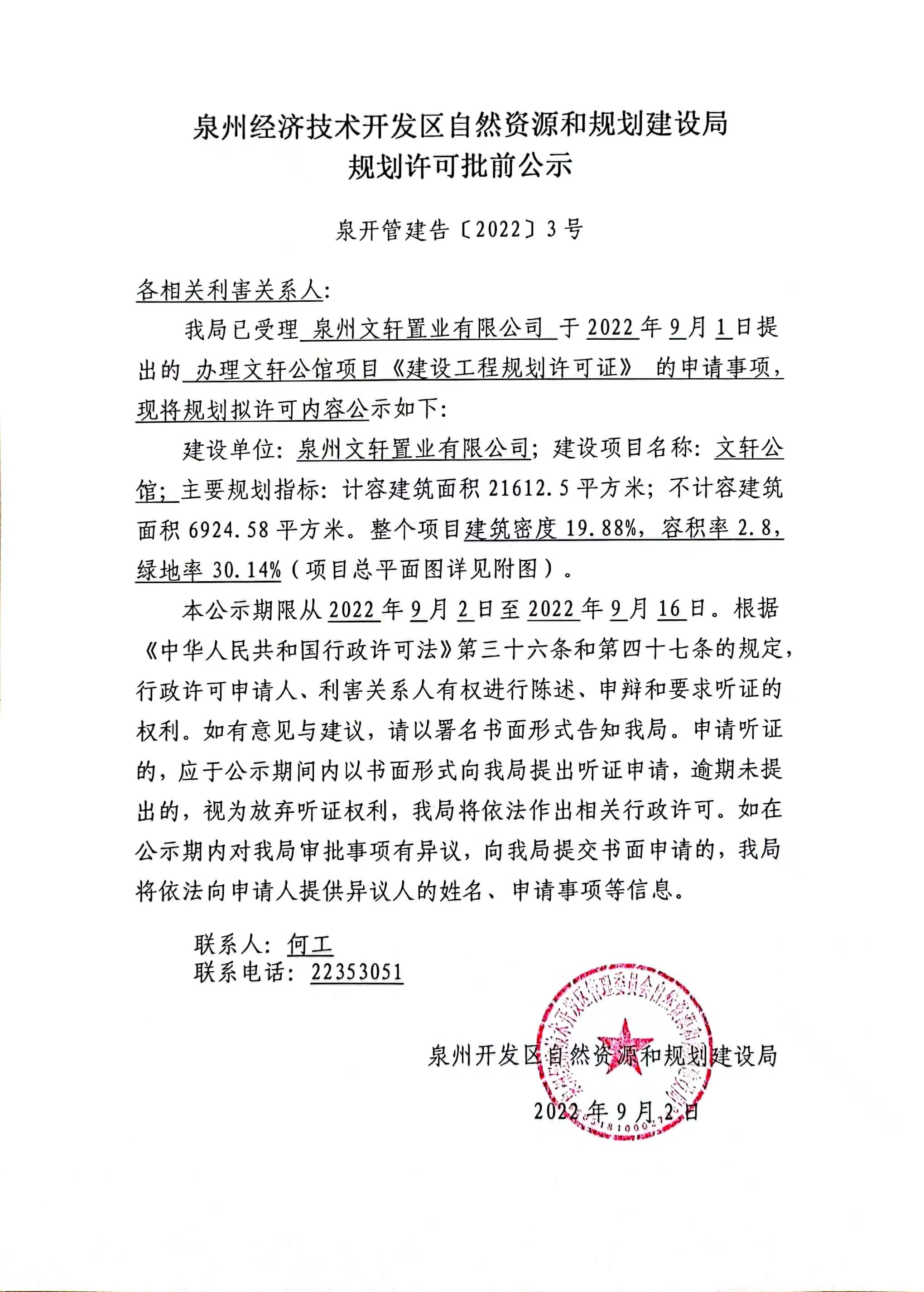 自然资源和规划建设局规划许可批前公示(泉州文轩置业有限公司)