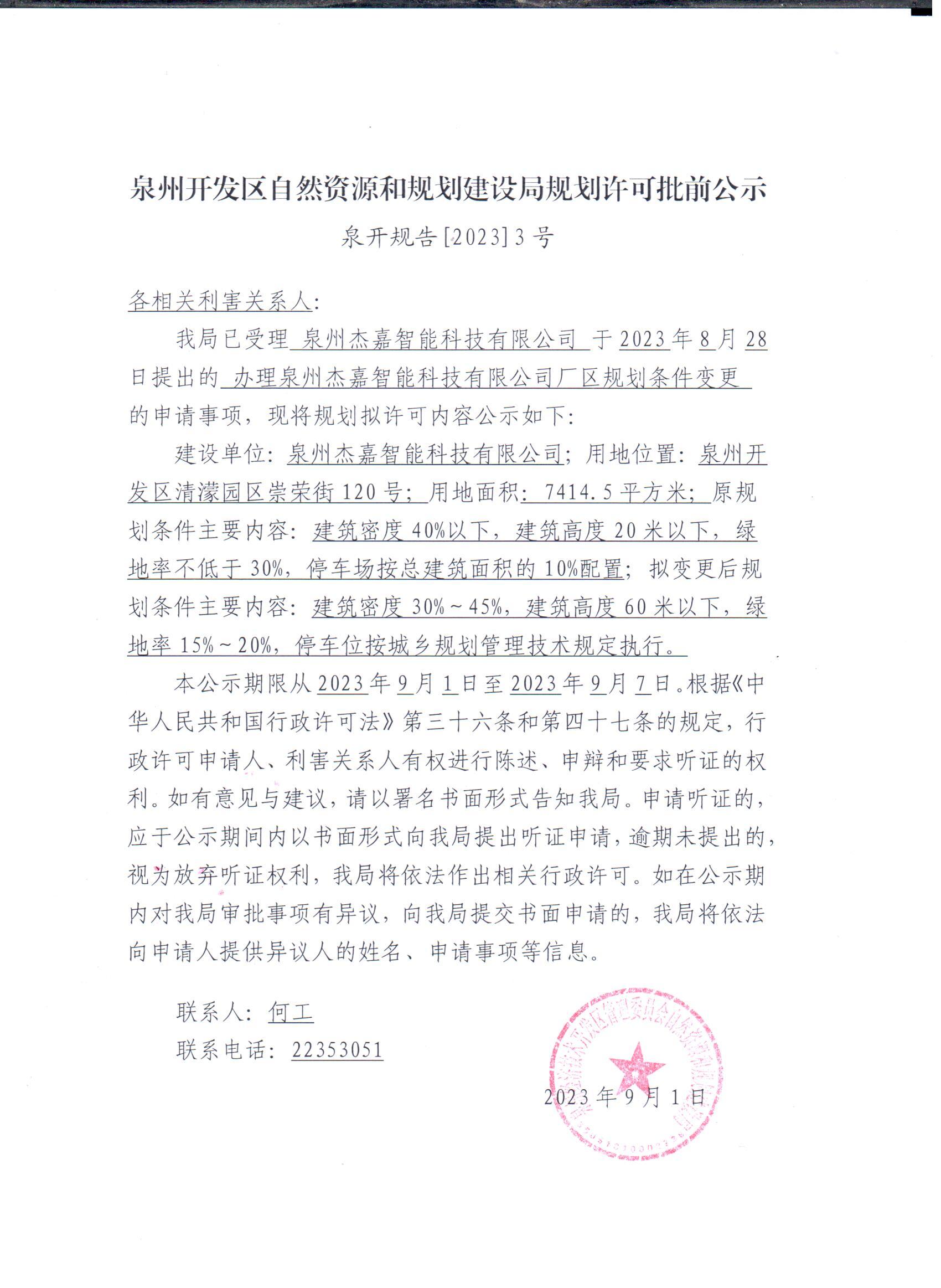 自然资源和规划建设局规划许可批前公示(泉州杰嘉智能科技有限公司)