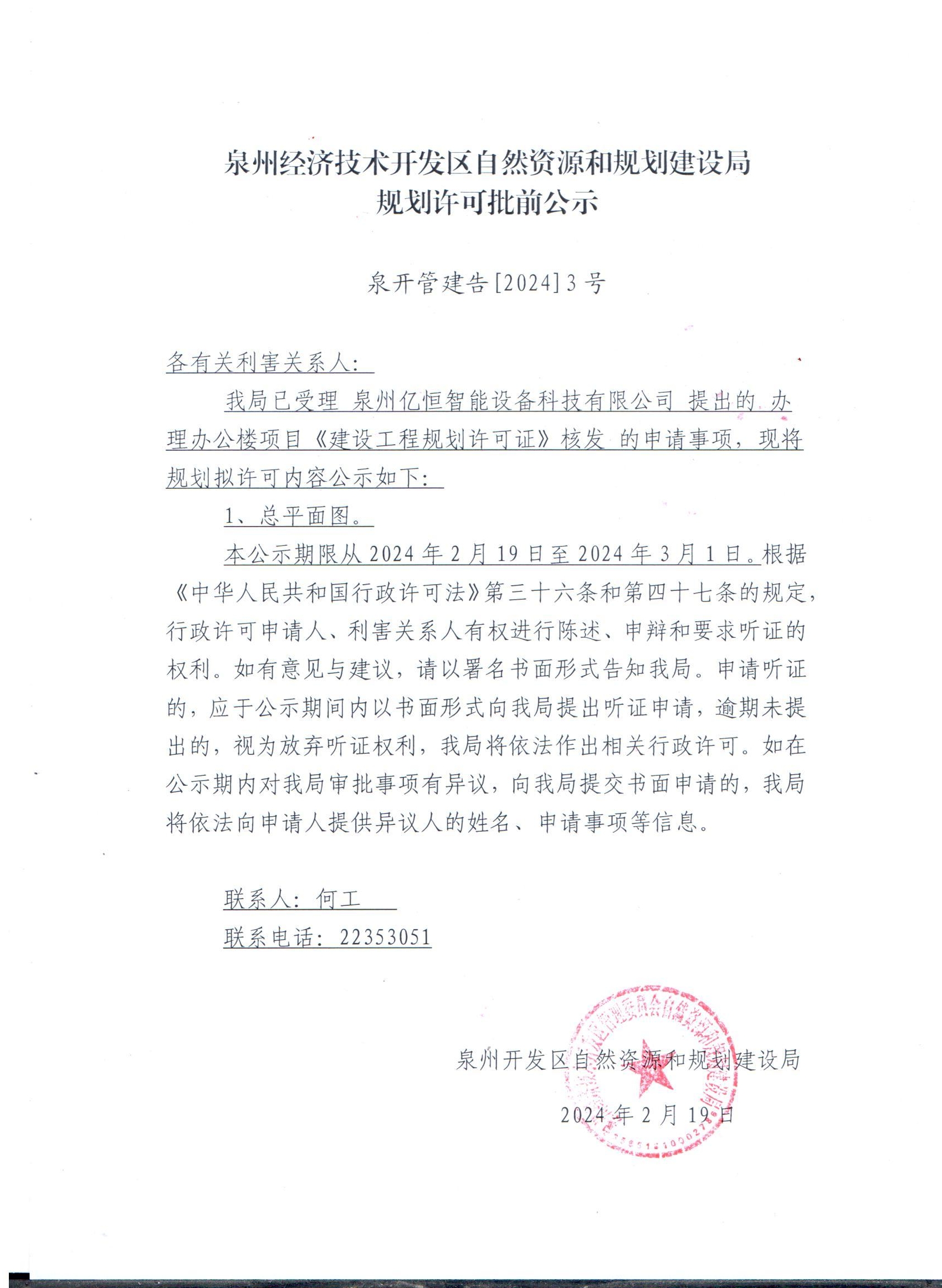 自然资源和规划建设局规划许可批前公示(泉州亿恒智能设备科技有限公司)