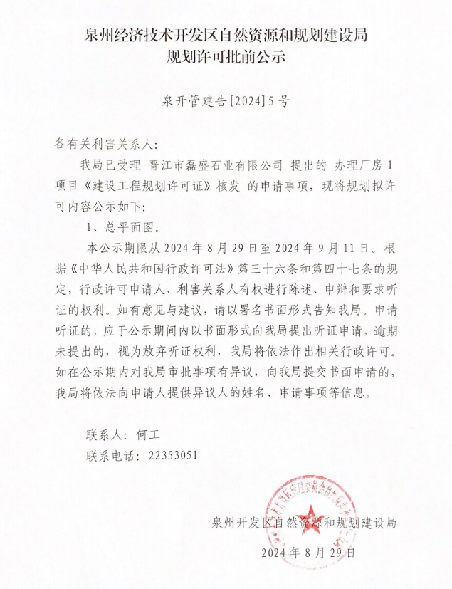 自然资源和规划建设局规划许可批前公示(晋江市磊盛石业有限公司)
