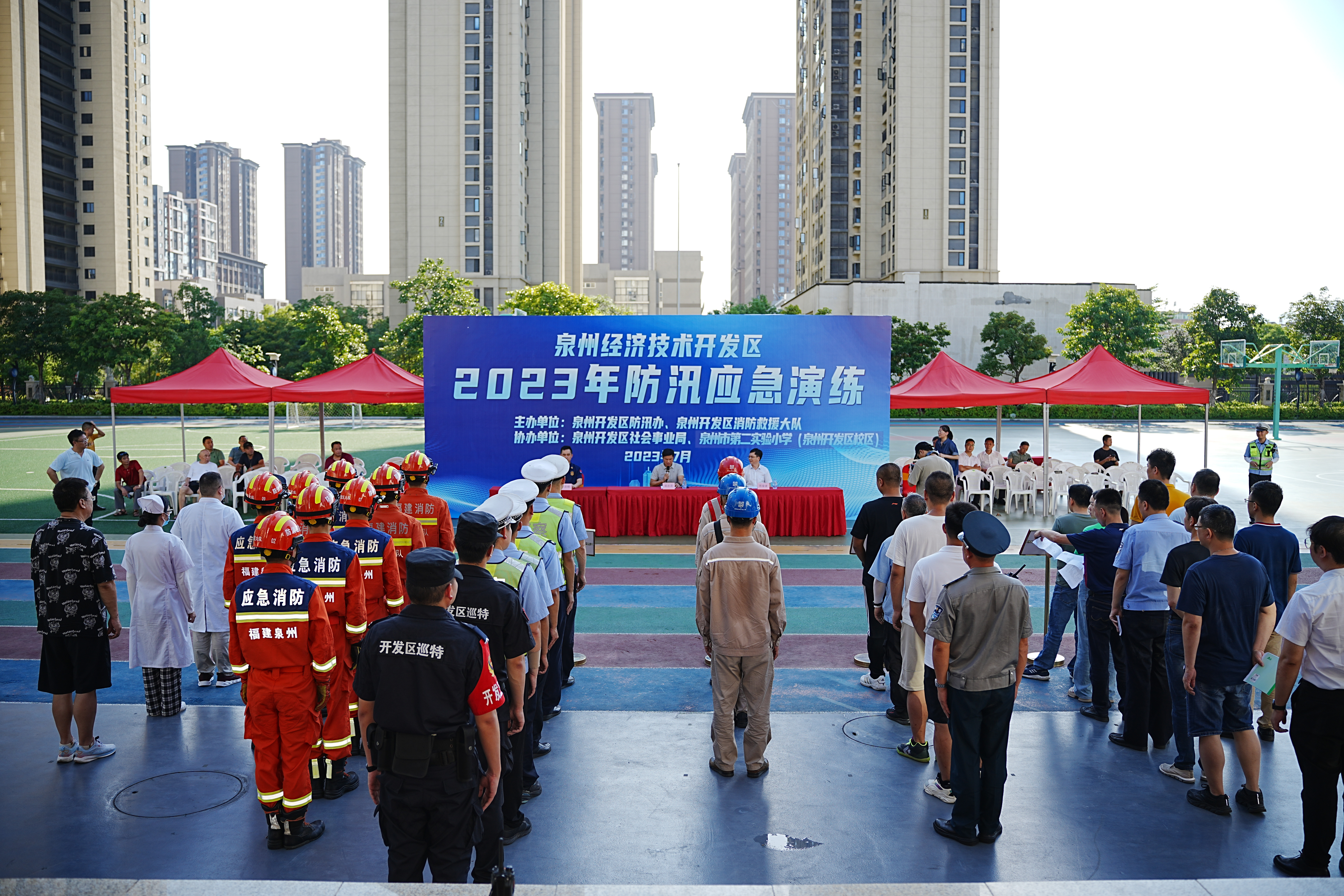 组织开展全区防汛应急演练工作。党工委委员、管委会副主任吴志灵,区防汛抗旱指挥部各成员单位负责人、各居民小区物业管理公司负责人,共50多人参加了演练。