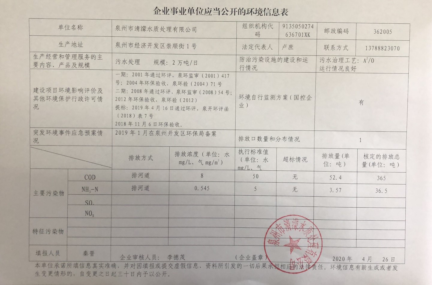 2020年第一季度企业事业单位应当公开的环境信息表(泉州市清濛水质处理有限公司)